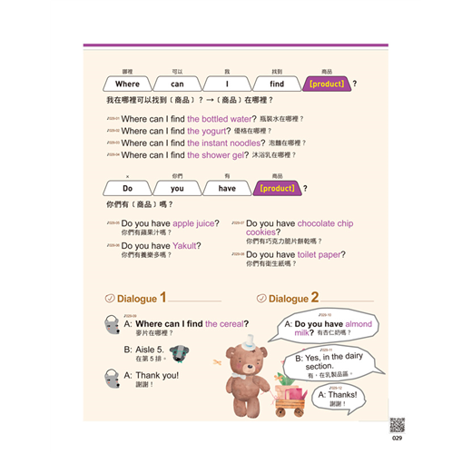※學到句型「Where can I find [產品]? 我可以在哪裡找到[商品]?/[商品]在哪裡?」。