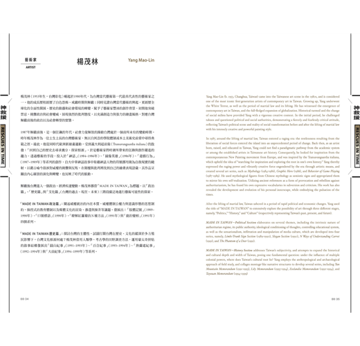 楊茂林(1953年生,台灣彰化)崛起於1980年代,為台灣當代藝術第一代最具代表性的藝術家之一。他的成長歷程經歷了白色恐怖、戒嚴時期與解嚴;同時見證台灣當代藝術的興起,更經歷全球化的全面性開展。歷史的動盪和社會環境的轉變,賦予了藝術家豐沛的創作背景,初期他突破禁忌,挑釁政治與社會權威,展現強烈的批判態度,以充滿創造力與張力的繪畫風格,對應台灣解嚴前後的政治以及社會轉型的實態。
