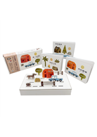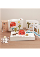在這系列的書中,雍.卡拉森運用文字和圖像和小讀者玩遊戲。每當打開一個跨頁,書中角色在右頁登場,翻頁後,就改變了位置、到了左頁,隨著故事/時間的推移,漸漸地就完成了農場、森林和小島。我們將這樣的遊戲概念實體化,為孩子們設計了《你的農場戲組》,將書裡的畫面、腦中的想像轉化成可以操作的實際場景。在共讀之後,孩子可以動動小手,親手打造專屬於自己的農場。別忘了,引導孩子在空白立牌上創作想要加入農場的角色,讓「我的」農場變得更熱鬧。