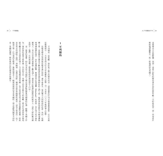 一九九九年之後地方分權的實施,進一步證實了這個走向,同時間歐盟的發展,也加深不列顛內部的裂痕,史壯即親眼見證了二○一六年的脫歐公投,及其所帶來的各樣爭議與區域歧見。簡言之,四國族(英格蘭、威爾斯、蘇格蘭與北愛爾蘭)及歐盟的問題,讓「不列顛認同」重新面臨檢視,而史壯選擇了從歷史觀照。他認為:「一個對自己的過去一無所知的國家,將失去它的認同。」於是,他在書中沿著歷史發展的脈絡,從西元一世紀羅馬人征服不列顛、一○六六年的諾曼征服、十七世紀「三王國」之戰,到一八○○年「聯合王國」的成立,清楚讓讀者知道「不列顛人」何時出現、何時成形?他的答案是在十八世紀末,那時不列顛已成為「單一民族國家,而這個民族便是不列顛人」。