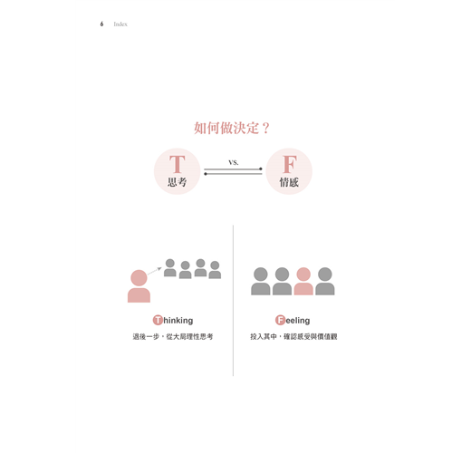 而Thinking(思考)傾向的人則偏好用邏輯來分析,做決定優先想到的是:這個決定是不是合理的?是否符合一般大眾價值觀?是否可以將優點最大化、風險最小化?