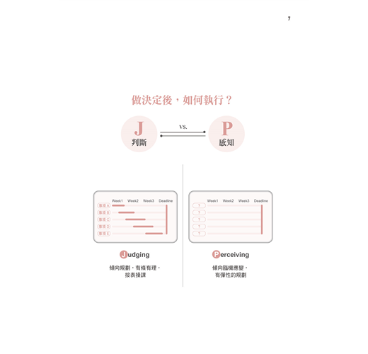 相對地,P(Perceiving,認知型)傾向的人,他的原廠模式是體驗他所處的世界。為了有更多體驗,他們不喜歡太早做好所有決定,也不想錯過那些出乎意料的驚喜。例如,如果沒有必要,我先不決定今天往哪個方向走,看看今天的天氣、心情、有沒有人約等,再來做決定。
