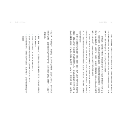 本書展現了InnSæi的智慧如何透過我們的身體表達出來:包括皮膚、脊椎、神經系統、大腦、心臟、腸道和感官。在你閱讀本書的過程中,你會經常被提醒萬事萬物是如何相互連結的,我們的主要組成成分是和星星相同的物質,而且近年來在人類遺傳學、腦波檢測以及我們身體的電磁場領域的科學研究發現,你我之間的邊界其實並不清楚。人類和地球都有我們不能跨越的界限,否則我們的再生能力將受到威脅。InnSæi涵納了這一切,當我們與InnSæi深度相連時,我們將能具體展現出對自我和對世界的理解,而這會改變我們的行為和我們處世的態度。 過去我並未真正認識InnSæi,一直到我追隨夢想進入廣闊的世界,崩潰、失去希望並經歷了巨大的痛苦,才找到一條通往療癒和重新發現自我的道路。在我最黑暗的時刻,也就是我二十多歲接近三十歲的時候,我根本沒想過這種痛苦會帶領我到一些地方,遇見最了不起的人,也無法預見我會創立一個大學課程,而且根據InnSæi理念拍攝的紀錄片會在全球上映。我更無法想魯保羅(RuPaul)會在推特上分享我們的電影《InnSæi:內在之海》(在北美地區的副標題為「直覺的力量」),人們把InnSæi刺青在身上,或是受到內在之海的啟發而創作出精彩的藝術作品。 本書內容跨越了數個世紀,透過讚揚並探索內在世界來重新發現我們週遭的世界。書中囊括了來自世界各地的個人故事,包括我自己的,並融合了來自不同文化、科學和藝術領域的智慧。 如果我們忽視InnSæi或試圖讓它噤聲,它可能會進入休眠狀態,但我們的生命卻必須仰賴與它的連結。當我們順應InnSæi,我們便能活化它。我的故事,那個關於身心達到極限與失去希望的故事,絕非獨一無二的,而是來自各行各業許多人的共同經歷。曾有一段時間,我覺得周遭的一切都很不實在,生活無比艱辛、孤獨、黑暗、毫無希望。最終,我找回了自我,深入內在,找到了自己最真實的安全所在。我學會透過身體鍛煉,透過探索科學、哲學、文學、古老智慧、寫作以及簡單而持續的練習,與自己內在的宇宙連結起來,並悠遊其中。 過去的二十年裡,InnSæi帶給我勇氣,讓我能跟隨著內在的羅盤前往任何想去的地方,對此我深深感激。目前為止,我在職業生涯中擔任過近三十種不同角色。我當過電影製片人、顧問、詩人、統計學家、校長、劇作家、企業家、活動家、夢想家、藝術總監、總經理、創辦人、董事會主席等等。但我唯一真正認同的角色只有做自己,溫德,一個內心是藝術家的人、一個夢想家、一個能將想法化為現實的人。我也樂於說自己是個治療師、光明戰士或魔法師,這取決於我當天的感受──這樣的說法感覺自由多了。看世界的方式有很多種,這本書就是我看待世界的方式。 本書要獻給那些想要探索並有意識地存在於內在世界的人,藉此,我們能強化自己的歸屬感,以及我們與自己、他人以及地球之間的關係。 第一章〈InnSæi是什麼?〉檢視的是我們根據學派、文化和學科的不同,對直覺有何不同的定義。我們會探索InnSæi的文化起源,它的真正含義,模糊或阻礙它的東西,以及爲何與它的連結成了我重新找到方向的聖杯。我會分享自己生活和成長過程中的一些時刻,透過來自不同背景的人們的故事和個人旅程,更深入地了解InnSæi。我們發現,奠基於經驗與專業的InnSæi,能釋放出人類的最高智慧。原來,只要我們真正將一個詞彙的意義體現在生活中,它就能以一種全新的方式爲我們打開全世界。InnSæi透過我們全身的每個部位接收訊息,因此這一章還提醒我們,可以藉由各式各樣的方式來關注這個世界,並讓我們準備好運用書中提供的工具、建議和練習。 在第二章〈InnSæi的療癒力量〉中,我們將探索與InnSæi失去連結並在最終重新找回它意味著什麼。我們每個人在生命中都會經歷創傷,無論我們面臨的考驗是大或小,這些經歷都是我們的經歷,而且塑造了我們。本章告訴我們如何從痛苦的經歷中走出來,成為一個更堅強、更有慈悲心、更有智慧的人。我分享了自己的故事,敘述黑暗如何強迫我與內在連結起來,因為我沒有別的路可走了。我花了一段時間才爬出黑暗的泥沼,當時我不確定自己走出來之後的狀態會是僅僅存在著,還是會活得充滿生氣。 我們可以透過伊南娜(Inanna)的神話故事與痛苦做朋友,這位掌管生命與死亡的古代美索不達米亞女神教導我們如何讓痛苦深化我們的人性,幫助我們變得更有智慧。以冰川做爲比喻,我們的痛苦若非被凍結在內心,就是在我們承認它、寬恕它並放下它的時候,融化並蒸發。重新連結上InnSæi改變了我關注事物的方式,幫助我做出改變人生的決定。它幫助我明白,當我們將世界解讀爲支離破碎的、官僚的、孤立而各自爲政的,這就是它開始呈現給我們的樣子。與其停留在這樣一個分裂的世界裡,我更希望重新與內在連結起來,融入我周圍的人與世界中,處於當下,擁有勇敢且寬容的心靈。本章還涵蓋了那些從經驗中領悟到自己就是自己的治療師的人所提供的洞見;我們越是能與內在連結並治癒我們的內心世界,就越能夠與週遭世界產生聯繫並獲得成就。 在第三章〈內在之海〉,我們將潛入那無邊無際的動態內心世界,它持續在流動,幫助我們建立新的連結。海洋是意識的最古老象徵,雖然我們對這兩者的認識都十分有限,它們卻有許多共同點,能幫助我們解釋內在之海