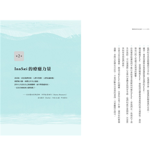第1章:何謂InnSæi? 透過冰島文化與現代科學來討論InnSæi,並練習與身體和自己的心連結,幫助我們準備好運用自己的直覺。 第2章:InnSæi的療癒力量 重新找到我們與內在的連結,成為更堅強、更有同情心、更有智慧的人。 第3章:內在之海──了解你的InnSæi並順應它 學習如何更好地利用我們的「心流狀態」。 第4章:向內看──自我覺察能幫助你掌握InnSæi 提出五種儀式,以清除障礙、重新與我們的直覺聯繫。 第5章:由內向外看──運用InnSæi來導航 介紹現代的個人和集體導航工具:「兩種節奏和強大的內在羅盤」,能夠調整身心並加強實踐目標。