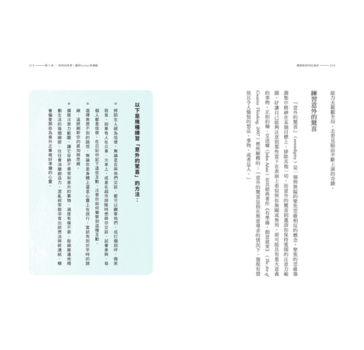 讀者可以隨時記錄與探索《覺察你的內在海洋》書中所提供的練習:與身體和自己的心連結、扎根(回到當下)、感恩、正念、呼吸……等等實用覺察方法,並嘗試與自己的「內在直覺」重新建立聯繫。