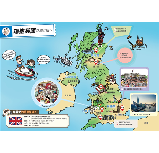 孩子是否開始對台灣以外的國家產生興趣了呢?無論是課業需求或旅遊需求,瞭解世界上的其他國家,都是各國小朋友的學習趨勢與必備知識,現在就讓勇老師帶著孩子們環遊世界大冒險吧!每本書都是十站各個國家的重點地區,簡單但深入地帶領孩子瞭解世界歷史、文化和地理環境。