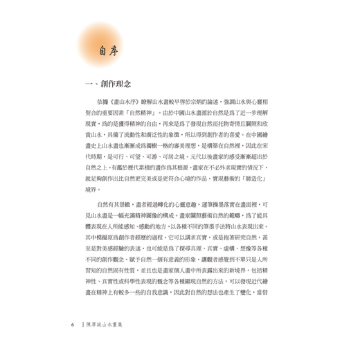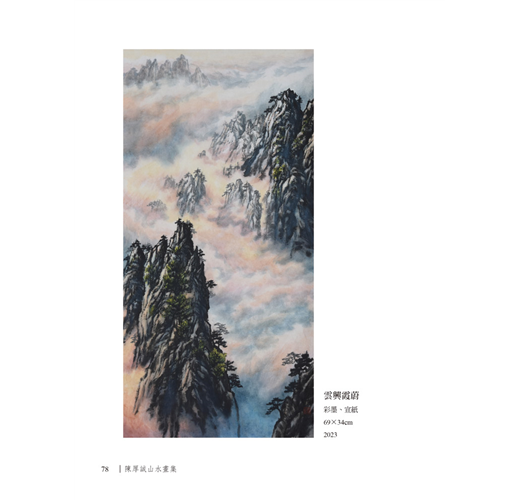 山水畫它可以講求真實,或是抱著研究自然,甚至是對美感經驗的表述,也可能是為了探尋真理、真實、虛構、想像等各種不同的創作觀念。《陳厚誠山水畫集》於繪畫創作上加深對大自然山川的進一步研究,聚焦於雲霧、瀑布、溪水、海浪、湖潭、洞穴、屋宇、花木等主題,期待能使觀者通過畫作感受山川美景的韻味與風采。