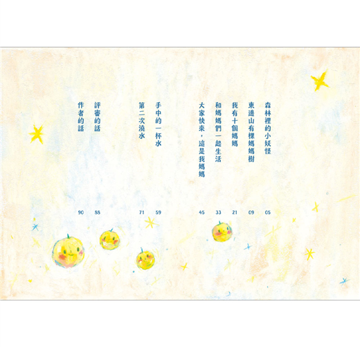 《媽媽樹》故事源於一個再尋常不過的黃昏,溫暖的陽光輕柔灑下,融化在廟口的矮樹叢上,金燦燦的,就在那時,我忽然看見那棵矮樹上頭結了一顆顆又大又圓的人臉果實,還發出了奇怪的叫聲:「媽、媽。」