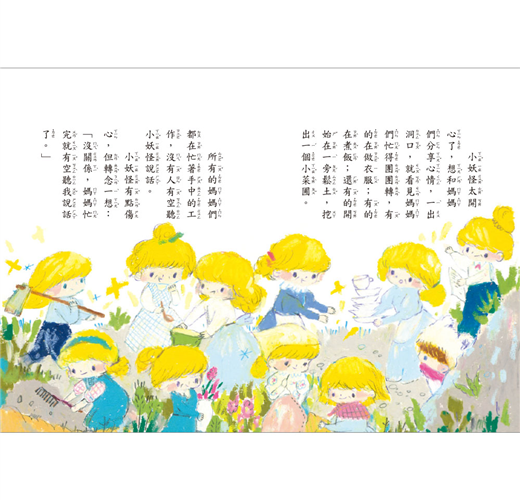十位媽媽的言行舉止,不論是家務、安慰、傾聽,甚至是指責,描述得極有畫面,所有親子互動的場景,呈現於故事線的每個細節裡,整體氛圍聚焦明確。隨著情節,像是走進每個家庭小劇場,如此熟悉,共鳴極強,但因為是以小孩的真實情感述說,所以並不陳腔老套。比如一開始有媽媽就急著炫耀;被媽媽糾正便惱羞成怒的不要媽媽;失去後的故作堅強,再度得到的不敢置信;小妖怪的情緒起伏,在簡潔卻靈巧的文字裡,絕對能與全天下的親子們合拍有共感。