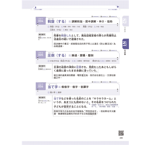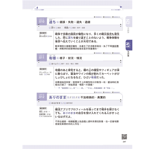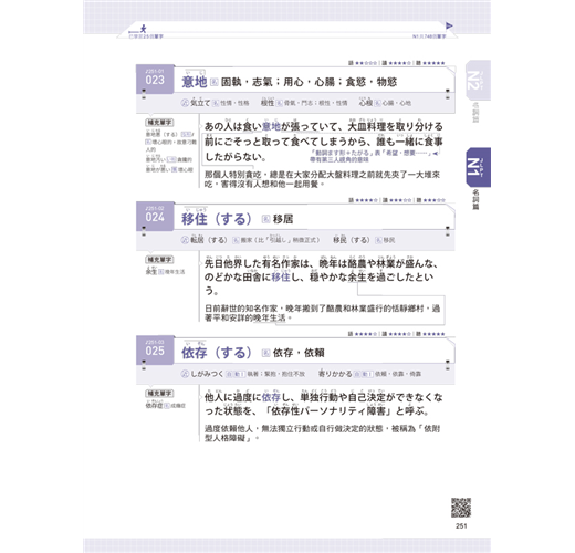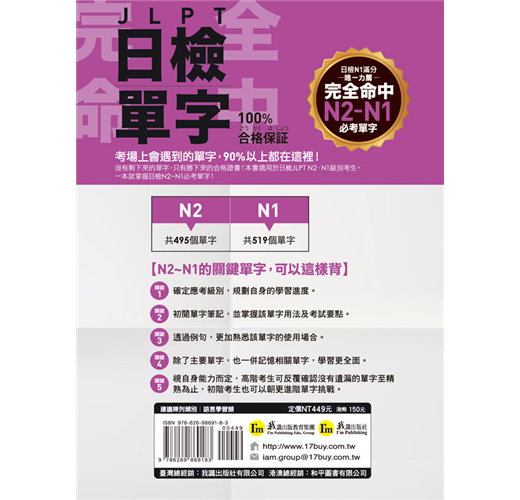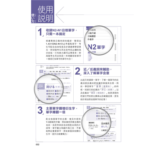 本書收錄N2-N1所有必考單字!對N2考生而言是考前必讀的高分密技,行有餘力還可以學更多;對想挑戰最高級的N1考生而言則是一本兼顧背新單字+複習已知單字的單字大全!