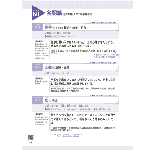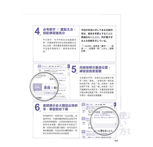 由日檢滿分王凪Nagi老師整理,用自身精通日檢、獲得N1滿分的經驗,以星號多寡分別標示出該單字在日檢的三大題型:文字語彙、讀解、聽解中的出題頻率,讓考生依照自身需求加強學習與複習,針對弱項加強實力。