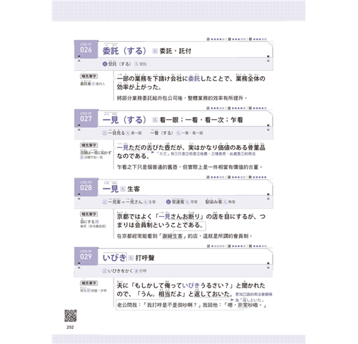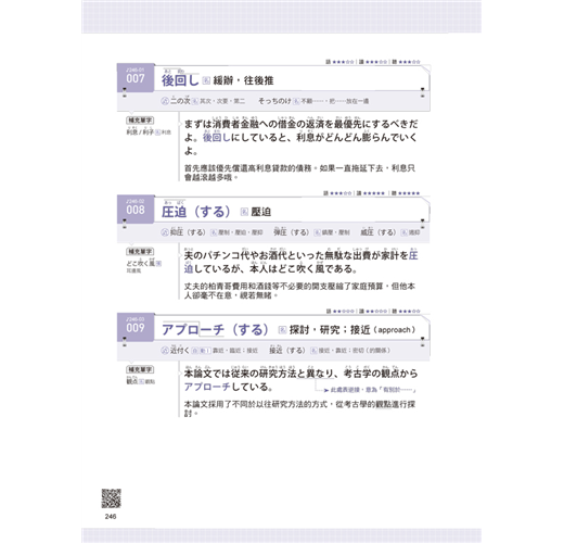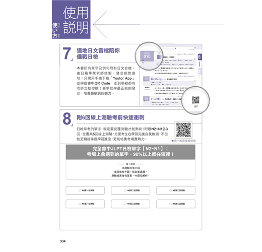 背完單字,手癢想刷題?你對單字可不能只有一面之緣,本書附贈N2-N1單字線上測驗,在背完單字後持續刷題,把單字讀音及用法深深刻進腦袋中,集中火力掃蕩生難字詞!