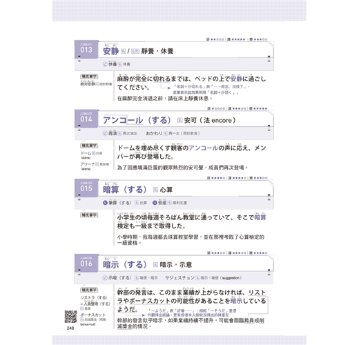 每一個單字連結1至2個相關字彙,從1,471個單字推至3,000以上個單字,不僅熟記主題單字,更能掌握其相關衍生字,搭配上例句,提升日檢實戰力。
