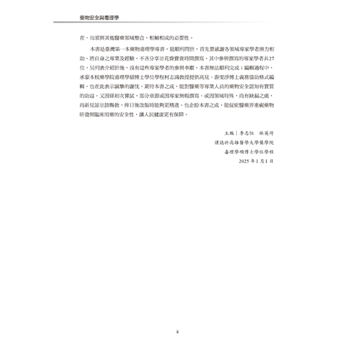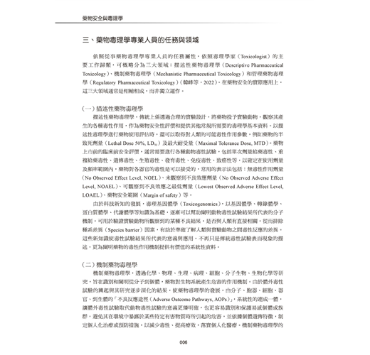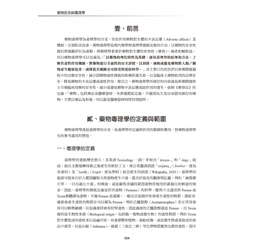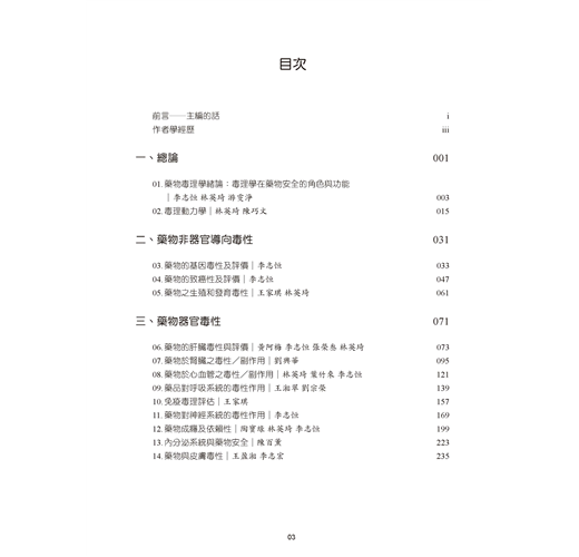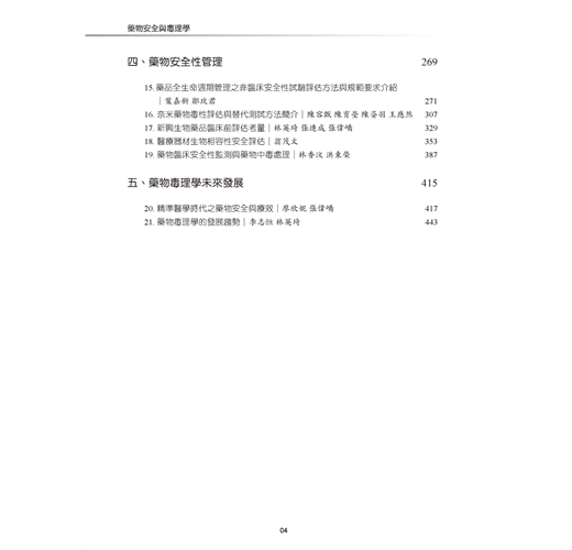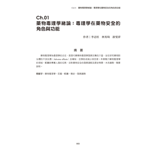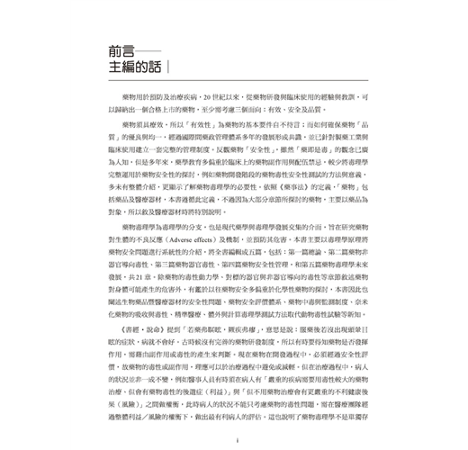 所有篇章的主題皆期待增進讀者對藥物安全的認知,藉由得知學習藥物毒理學的目的與用途,同時了解藥物安全在藥物開發與臨床應用上的重要性,進一步為患者提供更高品質的健康管理,及推動合理的醫療決策。