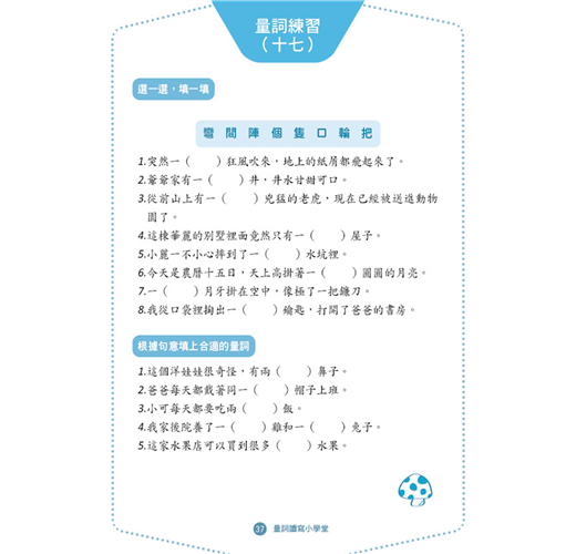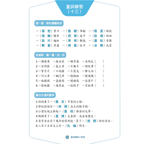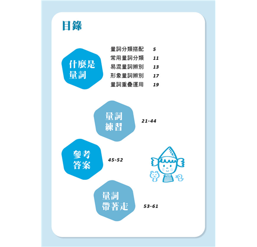 2.由簡單的單項練習到生活場域的統整應用,循序漸進變換命題型態,全方位掌握量詞的學習及應用。