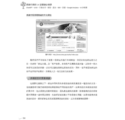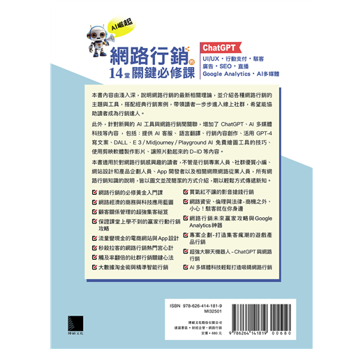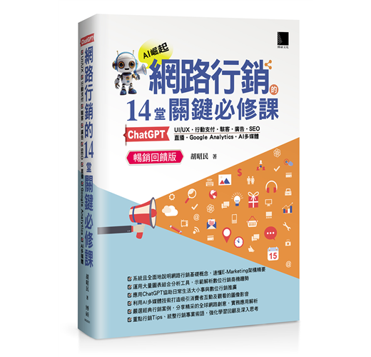 • 網路行銷的14堂關鍵必修課:ChatGPT‧UIUX‧行動支付‧駭客‧廣告‧SEO‧直播‧Google Analytics‧AI多媒體 (暢銷回饋版)