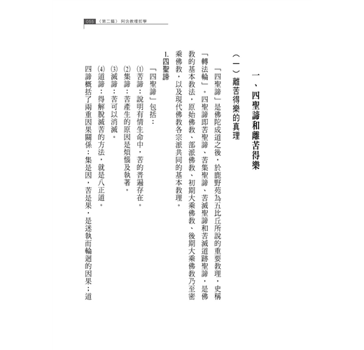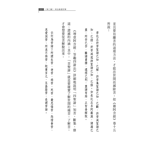 「四聖諦」是佛教的基本教法,為原始佛教、部派佛教、初期大乘佛教、後期大乘佛教乃至密乘佛教,以及現代佛教各宗派共同的基本教理。《阿含經》的修道次第,可以說是大、小乘諸經中,最為明確和詳盡的。「八正道」是修行得解脫的主要道路;其中「正念」、「正定」、「正智」三核心,則是能夠離苦得樂,最重要的修道次第。解脫不是遠離生活,而是在生活中覺醒,開啟智慧必須在生活中歷事練心。