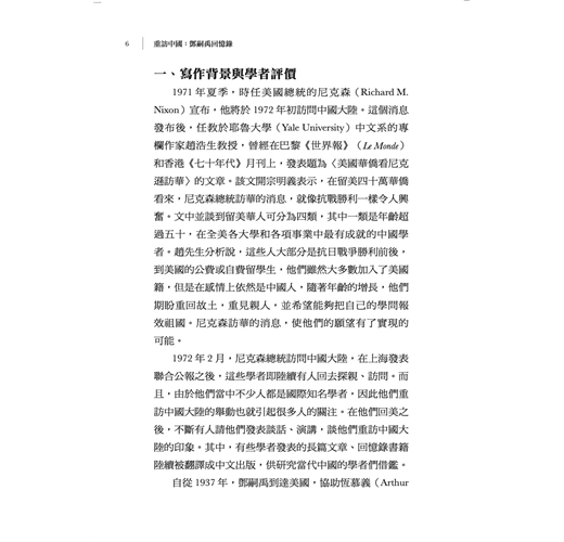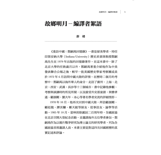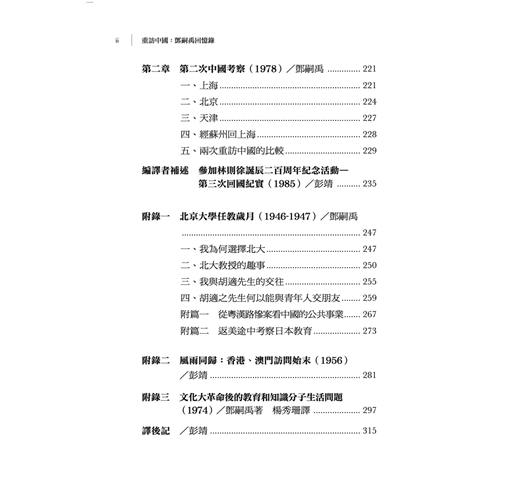 本書並收錄鄧嗣禹1946-1947年在北京大學教書,以及1956年訪問港澳始末、1985年三度「重訪中國」的相關記述。