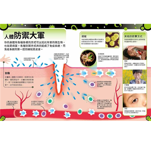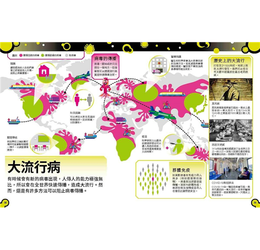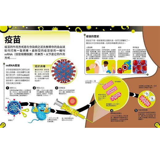 增訂版新增全球大流行病和疫苗的生動圖解,讓兒童了解微生物與疾病的關係。