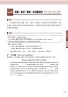 參照與文章有內容有關的摘要、筆記、圖表、流程圖,從文章中找出對應其中的空格的詞句,並將詞句填入空格。通常會要從特定的段落中找出對應的詞句,而不是從整篇文章。