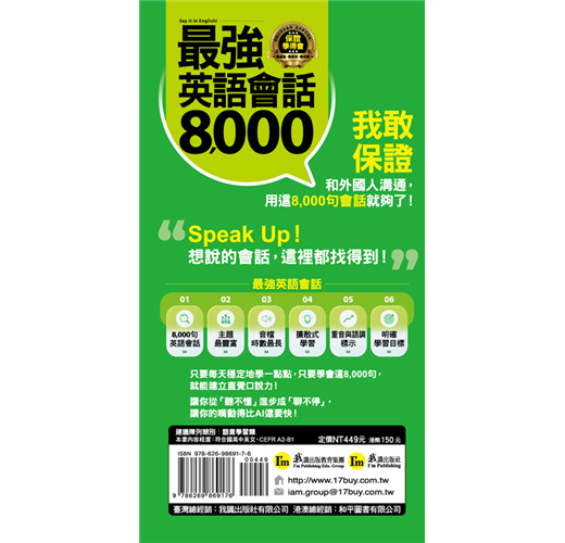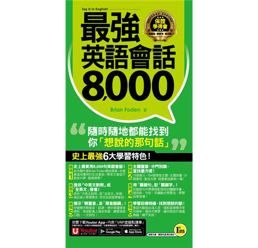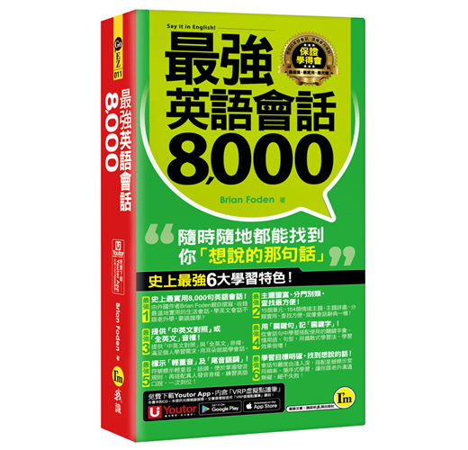 《最強英語會話8,000》精選收錄內容最完整的英語會話句。遇到臨時需要開口的時刻別慌張,隨翻隨找,都能馬上找到你想要說的那一句。一書在手,讓你遇到老外時,能完整表達、決不再詞窮。