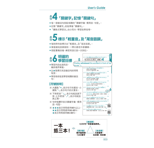 從會話句中學習搭配使用的關鍵字彙、慣用語、句型,透過擴散式的學習方法,讓你不只是記住單一的句子,而能以一句帶多字,迅速擴充字彙量,大幅提升學習效率,由小而大的擴散學習法,能將所學習到的內容納入長期記憶中,真正做到學一句就能靈活運用十句,達到學一次用一輩子的閱讀成效!