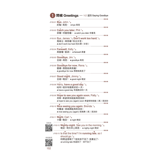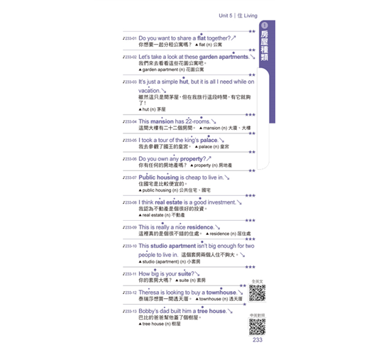 精心設計難易度逐步提升的編排方式,並以星號清楚標示常用頻率。無論你的英文基礎如何,都能從適合自己的程度開始學習,逐步提升口說能力,快速找出適合的句型,立即應用於日常對話中,保證讓你與老外對話溝通順暢無礙,輕鬆達成你的英文口說目標!