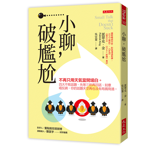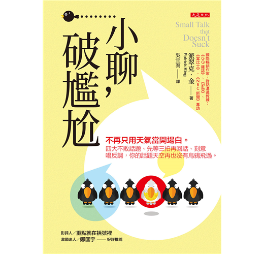 這本由社交技能教練派翠克.金所寫的《小聊,破尷尬》,就是剖析這些社交情境,讓你在社交場合獲得力量與啟發,不再感到尷尬,讓你成為喜歡閒聊的人。