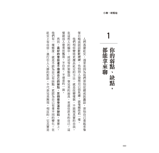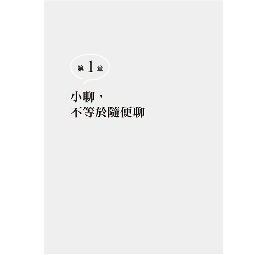 此外,我整理小聊的所有原則,這些原則能幫助你掌握對話的能量與流暢度,開啟對他人的好奇心,並在對話中展現最真實、獨特且坦率的自己,也會詳細討論我們到底要說什麼、什麼時候說、如何說,以及當事情不順利時該怎麼辦。