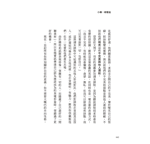強烈的對比和自嘲,總能讓對方會心一笑,甚至主動分享自己的失敗趣事。幽默不僅讓對話更輕鬆,也讓彼此的關係瞬間升溫。作者在書中提到的這類技巧,像是用輕鬆的語氣化解緊張、用自嘲展現自信,真的是一門值得學習的藝術。