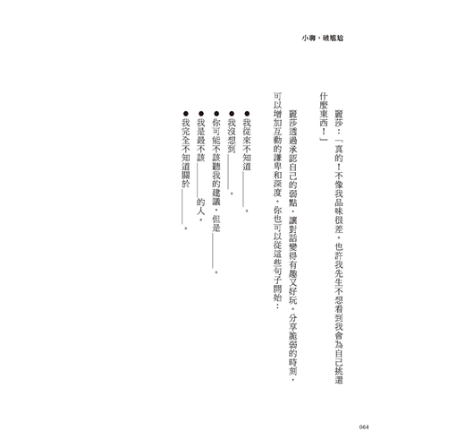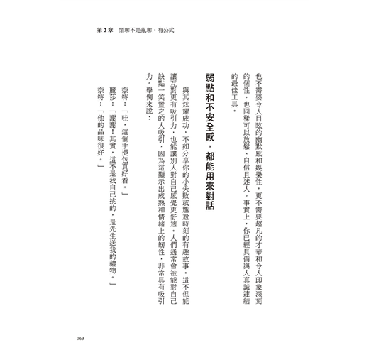 第二章〈閒聊不是亂聊,有公式〉與第三章〈如果好的對話是一臺機器〉則告訴讀者,可以透過什麼樣的方式與對方溝通,說出感受;如何在對話中與對方建立關係,該怎麼從對話的基本要素「提問」,來取得信任。