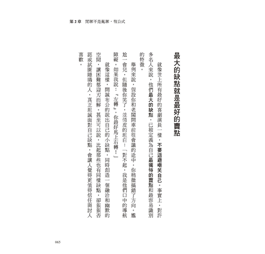 更讓我有共鳴的是作者在書中提到,聊聊自己的缺點,往往是創造幽默為彼此聊天加分的潤滑劑。我一直相信,適度的自嘲不僅能化解尷尬,還能拉近彼此的距離。例如我和新朋友聊到自己是作家,還出過23本書時,都會提到: