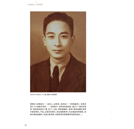 劉雨虹《說南道北——說老人、說老師、說老話》:「《禪海蠡測》,就是老師三十六歲那年寫的。……這張照片,老師穿的是西裝,還打了一個紅色領帶,猜想老師寫好了書,鬆了一口氣,照張相慶賀一番吧!那時拍攝彩色照片是很貴的。不過,這張彩色照片,是在基隆詹阿仁先生開設的照相館,由詹氏親自拍攝的。而這位詹老...