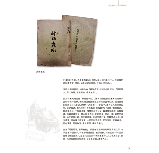 先生「聞已而思,瞿然有省」,於是在基隆海濱的矮屋風檐之下,左手抱著一個孩子,一隻腳蹬著搖籃,右手寫作,終於在1955年正式出版《禪海蠡測》,這是先生的第一本親筆著作,凡二十萬餘字,封底「為保衛民族文化而戰!」振聾發聵,激盪人心。