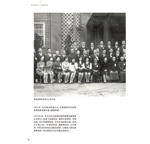 19 69年,先生聯合有識之士,於美國加州先創辦東西精華協會分會(國際總會)。