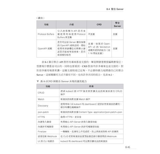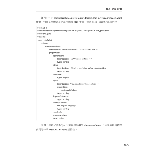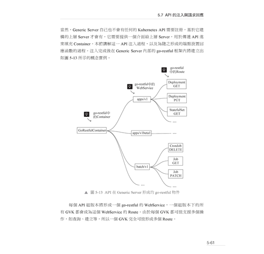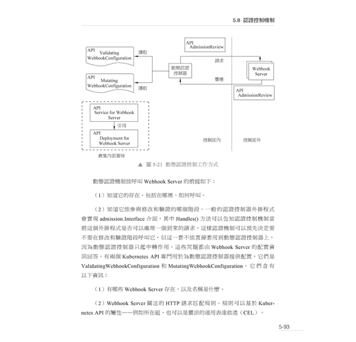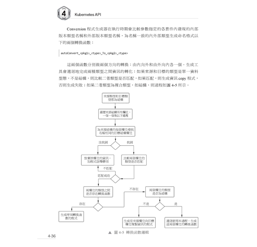 基礎篇 1 Kubernetes 與API Server 概要 ▌1.1 Kubernetes 組件 1.1.1 控制面上的組件 1.1.2 節點上的組件 ▌1.2 Kubernetes API 基本概念 1.2.1 API 和API 物件 1.2.2 API 種類 1.2.3 API 組和版本 1.2.4 API 資源 ▌1.3 API Server 1.3.1 一個Web Server 1.3.2 服務於API 1.3.3 請求過濾鏈與認證控制 ▌1.4 宣告式API 和控制器模式 1.4.1 宣告式API 1.4.2 控制器和控制器模式 ▌1.5 本章小結 2 Kubernetes 專案 ▌2.1 Kubernetes 社區治理 2.1.1 特別興趣組 2.1.2 SIG 內的子專案小組 2.1.3 工作群組 ▌2.2 開發人員如何貢獻程式 2.2.1 開發流程 2.2.2 程式提交與合併流程 ▌2.3 原始程式碼下載與編譯 2.3.1 下載 2.3.2 本地編譯與運行 ▌2.4 本章小結 原始程式篇 3 API Server ▌3.1 Kubernetes 的專案結構 3.1.1 頂層目錄 3.1.2 staging 目錄 3.1.3 pkg 目錄 ▌3.2 Cobra 3.2.1 命令的格式規範 3.2.2 用Cobra 寫命令列應用 ▌3.3 整體結構 3.3.1 子Server 3.3.2 再談聚合器 ▌3.4 API Server 的建立與啟動 3.4.1 建立Cobra 命令 3.4.2 命令的核心邏輯 3.4.3 CreateServerChain() 函數 3.4.4 總結與展望 ▌3.5 本章小結 4 Kubernetes API ▌4.1 Kubernetes API 原始程式碼 4.1.1 內部版本和外部版本 4.1.2 API 的屬性 4.1.3 API 的方法與函數 4.1.4 API 定義與實現的約定 ▌4.2 內建 API ▌4.3 核心 API ▌4.4 程式生成 4.4.1 程式生成工作原理 4.4.2 程式生成範例 4.4.3 觸發程式生成 ▌4.5 本章小結 5 Generic Server ▌5.1 Go 語言實現Web Server ▌5.2 go-restful 5.2.1 go-restful 簡介 5.2.2 go-restful 中的核心概念 5.2.3 使用go-restful ▌5.3 OpenAPI 5.3.1 什麼是OpenAPI 5.3.2 Kubernetes 使用OpenAPI 規格說明 5.3.3 生成API OpenAPI 規格說明 5.3.4 Generic Server 與OpenAPI ▌5.4 Scheme 機制 5.4.1 登錄檔的內容 5.4.2 登錄檔的建構 ▌5.5 Generic Server 的建構 5.5.1 準備Server 運行配置 5.5.2 建立Server 實例 5.5.3 建構請求處理鏈 5.5.4 增加啟動和關閉鉤子函數 ▌5.6 Generic Server 的啟動 5.6.1 啟動準備 5.6.2 啟動 ▌5.7 API 的注入與請求回應 5.7.1 注入處理流程 5.7.2 WebService 及其Route 生成過程 5.7.3 回應對Kubernetes API 的HTTP 請求 ▌5.8 認證控制機制 5.8.1 什麼是認證控制 5.8.2 認證控制器 5.8.3 動態認證控制 ▌5.9 一個HTTP 請求的處理過程 ▌5.10 本章小結 6 主Server ▌6.1 主Server 的實現 6.1.1 填充登錄檔 6.1.2 準備Server 運行配置 6.1.3 建立主Server ▌6.2 主Server 的幾個控制器 6.2.1 ReplicaSet 控制器 6.2.2 Deployment 控制器 6.2.3 StatefulSet 控制器 6.2.4 Service Account 控制器 ▌6.3 主Server 的認證控制 6.3.1 運行選項和命令列參數 6.3.2 從運行選項到運行配置 6.3.3 從運行配置到Generic Server ▌6.4 API Server 的登入驗證機制 6.4.1 API Server 登入驗證基礎 6.4.2 API Server 的登入驗證策略 6.4.3 API Server 中建構登入認證機制 ▌6.5 本章小結 7 擴充Server ▌7.1 CustomResourceDefinition 介紹 7.1.1 CRD 的屬性 7.1.2 客製化API 屬性的定義與驗證 7.1.3 啟用Status 和Scale 子資源 7.1.4 版本轉換的Webhook ▌7.2 擴充Server 的實現 7.2.1 獨立模組 7.2.2 準備Server 運行配置 7.2.3 建立擴充Server 7.2.4 啟動擴充Server ▌7.3 擴充Server 中控制器的實現 7.3.1 發現控制器 7.3.2 名稱控制器 7.3.3 非結構化規格控制器 7.3.4 API 審核控制器 7.3.5 CRD 清理控制器 ▌7.4 本章小結 8 聚合器和聚合Server ▌8.1 聚合器與聚合Server 介紹 8.1.1 背景與目的 8.1.2 再談API Server 結構 ▌8.2 聚合器的實現 8.2.1 APIService 簡介 8.2.2 準備Server 運行配置 8.2.3 建立聚合器 8.2.4 啟動聚合器 8.2.5 聚合器代理轉發HTTP 請求 ▌8.3 聚合器中控制器的實現 8.3.1 自動註冊控制器與CRD 註冊控制器 8.3.2 APIService 註冊控制器 8.3.3 APIService 狀態監測控制器 ▌8.4 聚合Server 8.4.1 最靈活的擴充方式 8.4.2 聚合Server 的結構 8.4.3 委派登入認證 8.4.4 委派許可權認證 ▌8.5 本章小結 實戰篇 9 開發聚合 Server ▌9.1 目標 ▌9.2 聚合Server 的開發 9.2.1 建立專案 9.2.2 設計API 9.2.3 生成程式 9.2.4 填充登錄檔 9.2.5 資源存取 9.2.6 撰寫認證控制 9.2.7 增加Web Server 9.2.8 部署與測試 ▌9.3 相關控制器的開發 9.3.1 設計 9.3.2 實現 9.3.3 如何啟動 9.3.4 測試 ▌9.4 本章小結 10 API Server Builder 與Kubebuilder ▌10.1 controller-runtime 10.1.1 核心概念 10.1.2 工作機制 ▌10.2 API Server Builder 10.2.1 概覽 10.2.2 Builder 用法 ▌10.3 Kubebuilder 10.3.1 概覽 10.3.2 功能 10.3.3 開發步驟 ▌10.4 本章小結 11 API Server Builder 開發聚合Server ▌11.1 目標 ▌11.2 聚合Server 的開發 11.2.1 專案初始化 11.2.2 建立v1alpha1 版API 並實現 11.2.3 增加v1 版本API 並實現 ▌11.3 相關控制器的開發 ▌11.4 部署與測試 11.4.1 準備工作 11.4.2 製作鏡像 11.4.3 向叢集提交 11.4.4 測試 ▌11.5 本章小結 12 Kubebuilder 開發Operator ▌12.1 目標 ▌12.2 定義CRD 12.2.1 專案初始化 12.2.2 增加客製化API ▌12.3 相關控制器的開發 12.3.1 實現控制器 12.3.2 本地測試控制器 ▌12.4 認證控制Webhook 的開發 12.4.1 引入認證控制Webhook 12.4.2 實現控制邏輯 ▌12.5 部署至叢集並測試 12.5.1 製作鏡像 12.5.2 部署cert-manager 12.5.3 部署並測試 ▌12.6 本章小結