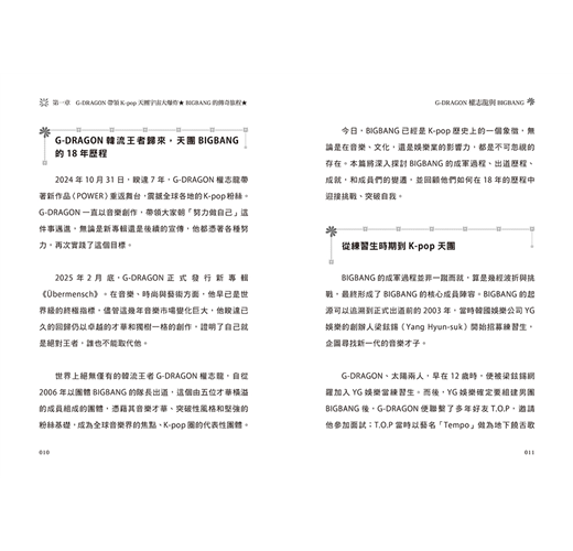 BIGBANG的歷史是一個充滿激情、創新與挑戰的過程。本書將深度解析靈魂隊長G-DRAGON與BIGBANG成員,看他們如何成為「明星收割機」,帶領K-POP影響全球的音樂圈,成為永遠的傳奇天團。