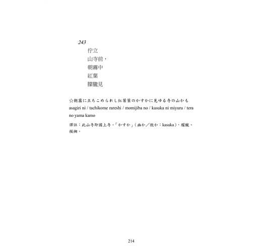 先後住了十多年的五合庵是半生漂泊的良寬安定或「求」安定之所——安於浮生的起伏,困惑,孤寂,不安……:「唯求/孑然獨立/秋之庵」(074首);「久住則安——/此際仿如身在/廬山陣雨中」(089首);「何處可覓/比國上山/更讓我心動的/住所——/無也!」(172首)。五合庵的「五合」指半升,人一日所需之米約五合——「五合」足矣,良寬以此明自己清貧生活之志: