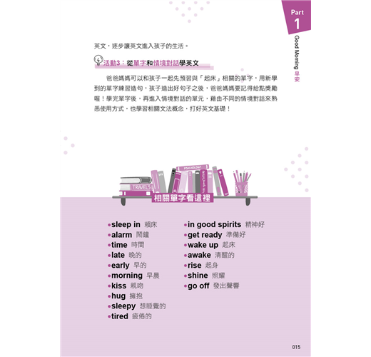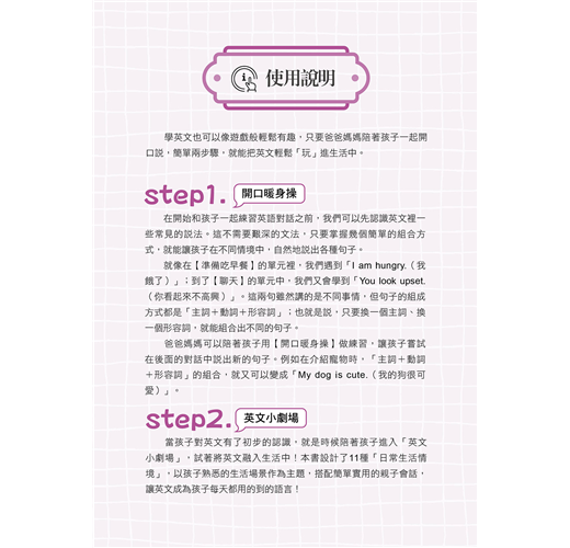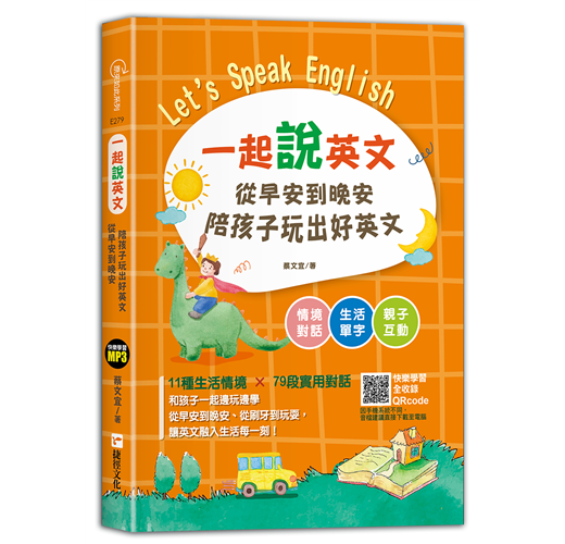 《一起說英文 從早到晚陪孩子玩出好英文》以「趣味活動」+「情境式對話+「生活單字」為核心,透過孩子熟悉的生活情境:起床、吃飯、換衣服、睡前說晚安等,帶出一句句貼近生活的小對話,讓英文自然而然融入生活每一天,幫助孩子踏出邁向世界的第一步!。