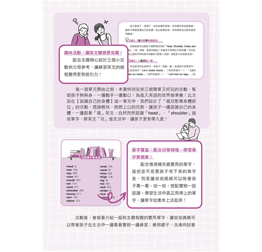 每個單元都安排3個趣味活動,從唱唱兒歌到動動手腳玩遊戲,讓孩子在日常生活中也可以常常接觸英文。
