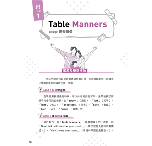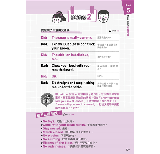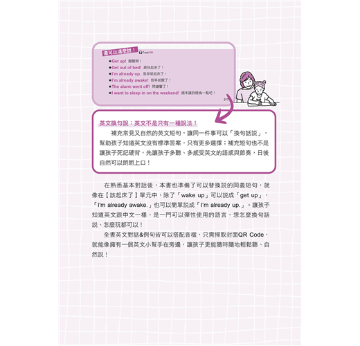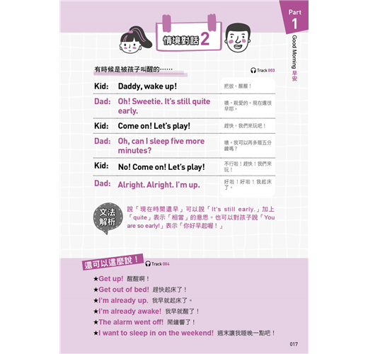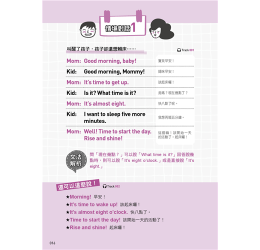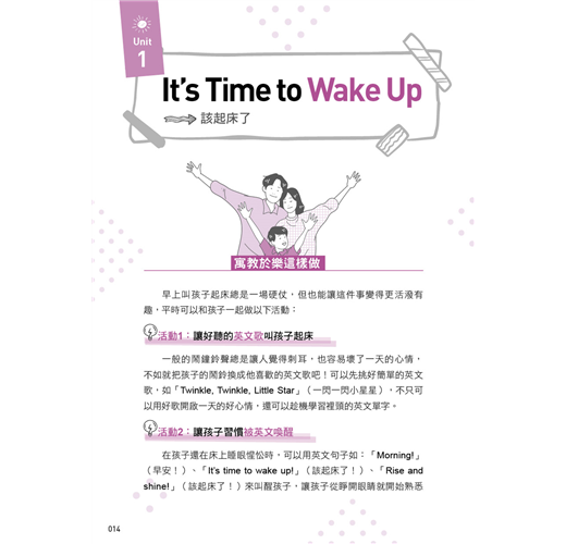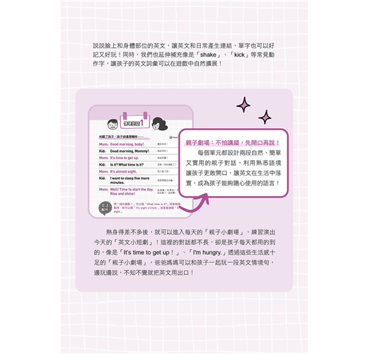 以孩子熟悉的生活場景作為主題,從「起床說早安」到「睡前說晚安」,搭配簡單好用的親子對話,讓孩子每天都能用到英文、說得出口。