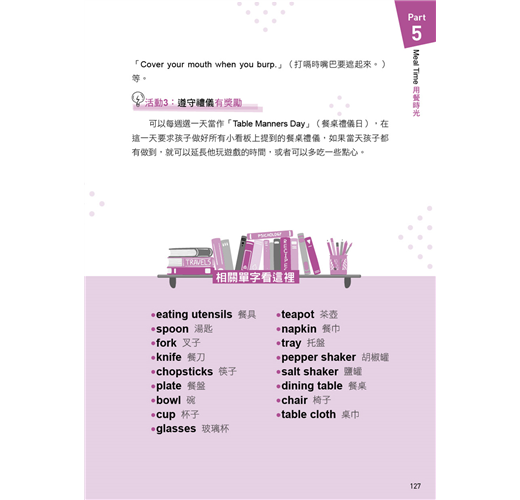搭配生活情境補充最實用的主題單字—照鏡子時認識眼睛、嘴巴怎麼說;吃飯時學會食物單字,讓孩子邊玩邊學,邊用邊記。