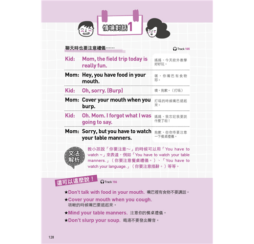 每個單元都設計兩段自然的親子會話,考量到孩子的基礎能力,書中設計對話簡單卻都超實用。像是「Good morning!」、「It's time for breakfast!」;更有隨掃隨聽的MP3,讓孩子輕鬆學會英文,還能馬上用在生活中。