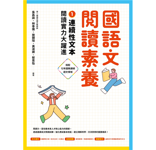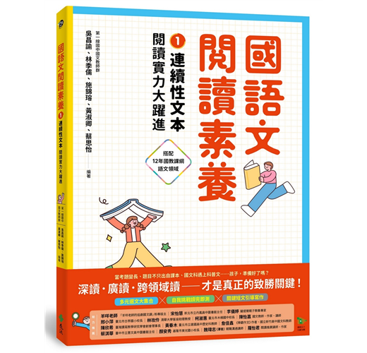 很高興看到五位來自臺灣各地中學語文老師透過多元選文,經由文本的引導與練習,培養閱讀素養與思辯能力,出版了這套《國語文閱讀素養》。上下兩冊分別選擇連續性文本及非連續文本,跨越科學、議題、文學、藝術……。從文本閱讀到閱讀後的試題挑戰,搭配短文表達練習,更貼心的提供延伸知識和參考資料,無論自學或是共讀應用,都是非常好的素材。想要提升閱讀力,這套書值得擁有,推薦給您!