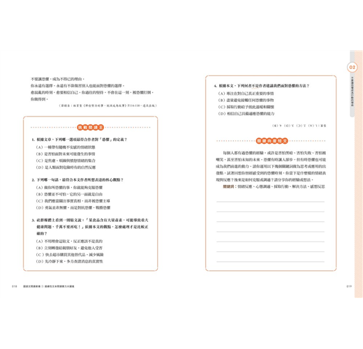 這兩本《國語文閱讀素養》,好看!它有趣到讓人不知不覺一篇接著一篇讀下去。為什麼?因為每篇文章的設計節奏抓得剛剛好:一開始是引人入勝的選文,接著立刻進入「挑戰閱讀王」──幾道不難的小題目,不但可以自我檢查讀懂多少,還會引導我們回頭重看文本,重新體會文字的味道。