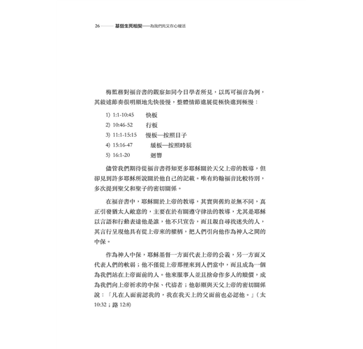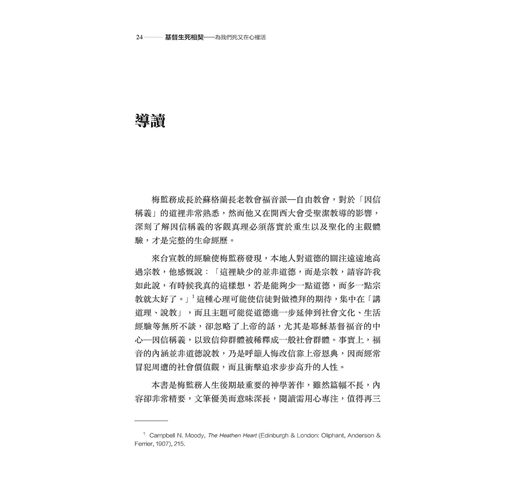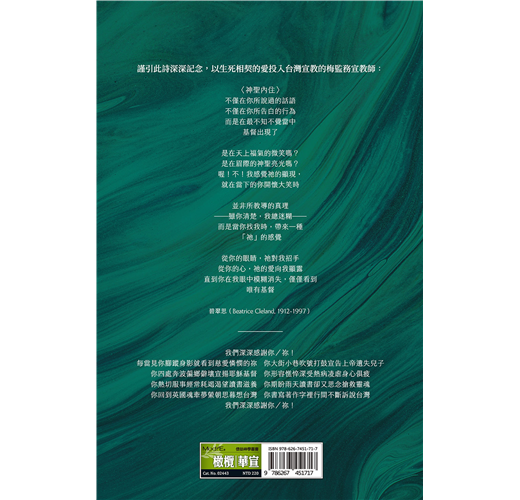 熱愛讀書研究的梅監務來台前後約30年,1924年返回英國後,他心中思思念念仍是台灣,曾數度計畫再來台服事,不幸終究被過去在台染上的宿疾攔阻,只能藉由寫作參與宣教,成為「寫作的宣教師」。《基督生死相契:為我們死又在心裡活》一書,是梅監務多年反覆思考「基督為我們」、「基督在我們裡面」的思想結晶: