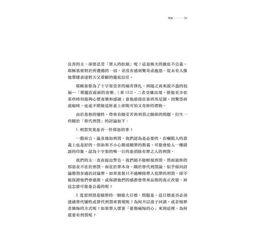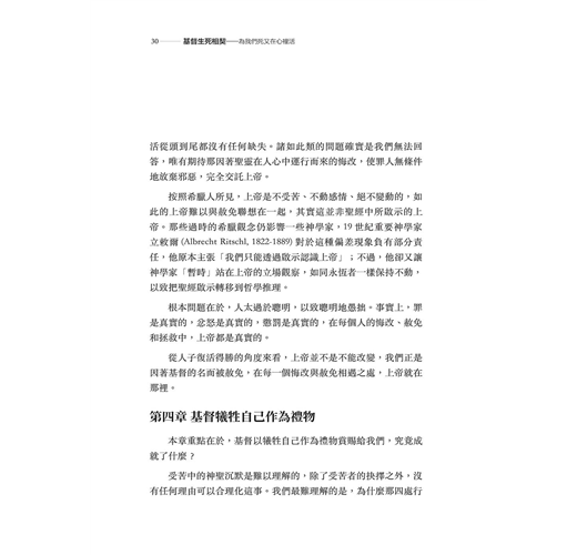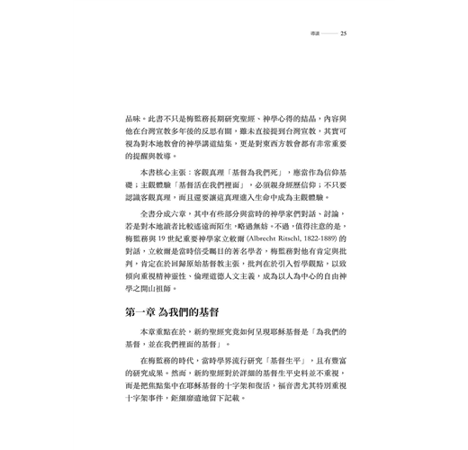 全書分成六章,其中有些部分與當時的神學家們對話、討論,若是對本地讀者比較遙遠而陌生,略過無妨。不過,值得注意的是,梅監務與19世紀重要神學家立敕爾(Albrecht Ritschl, 1822–1889)的對話,立敕爾是當時倍受矚目的著名學者,梅監務對他有肯定與批判,肯定在於回歸原始基督教主張,批判在於引入哲學觀點,以致傾向重視精神靈性、倫理道德人文主義,成為以人為中心的自由神學之開山祖師。