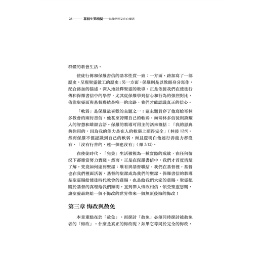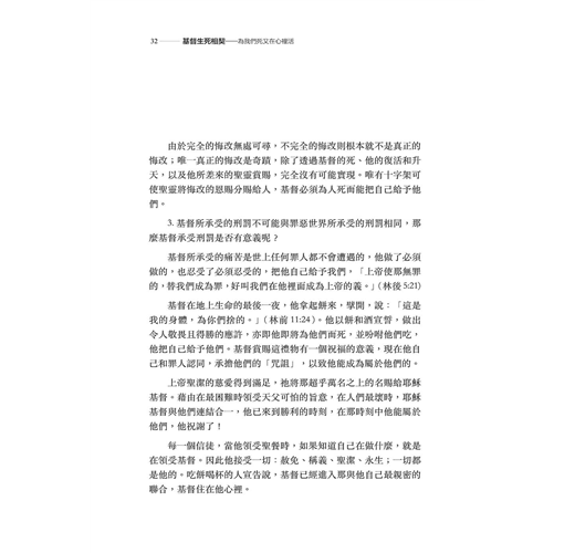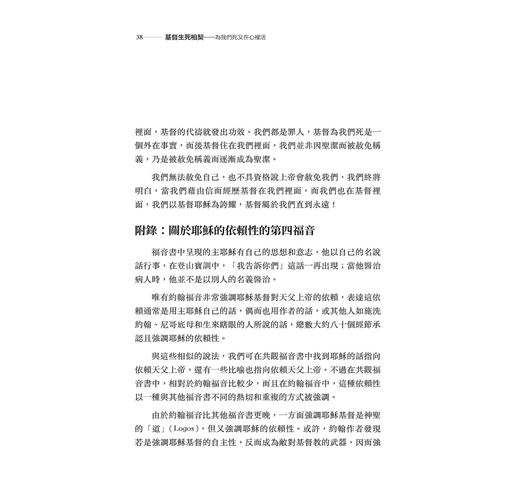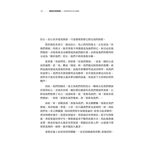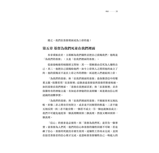 本書反思宣教地真正需要的基督教神學和信仰教導──若人僅僅用頭腦知道「基督為我們」,並不等於心中體驗「基督在我們裡面」,尤其並不意味著生活在耶穌基督的上帝國價值觀裡。我們不只要認識客觀真理「基督為我們死」,而且還要讓這真理進入生命中成為主觀體驗,經驗「基督活在我們裡面」。