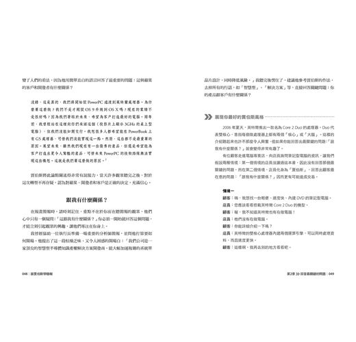 最能激勵人心的溝通者都有一個共同特質,能將深奧或日常的產品轉化成有意義的事物。星巴克執行長霍華.舒茲(Howard Schultz)賣的不是咖啡,而是介於工作與家庭之間的「第三空間」;財務金融專家蘇西.歐曼(Suze Orman)賣的不是信託和共同基金,而是財務自由的夢想。同樣地,賈伯斯賣的不是電腦,而是釋放人類潛能的工具。在本書中,請不斷問問自己:「我的賣點到底是什麼?」