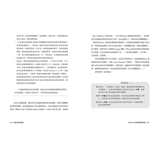 每個人都有驅策自己前進的熱情,本書旨在幫助你捕捉這份熱情,並將之轉化成一個令人著迷的故事,讓人願意幫助你實現你的願景。事實上,你的創意或產品或許能大大改善客戶的生活,無論是電腦、汽車、金融服務或是能改善環境的產品。然而世界上再棒的產品,如果少了強大的品牌信徒來推廣,也是毫無用處。如果你無法引人關注,你的產品永遠不會成功,你的觀眾不會在乎、不會理解、也不會感興趣。人們不會去關注無聊的事物,不要讓你的創意因為簡報未能激發聽眾想像力而被埋沒。運用賈伯斯的技巧,去打動每一位你希望影響的人。